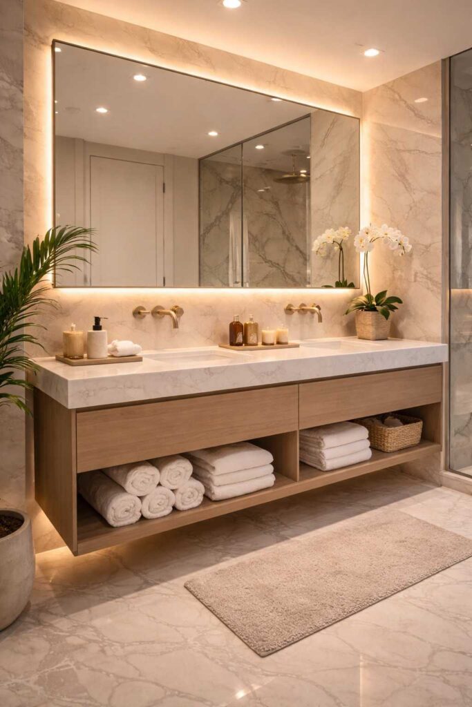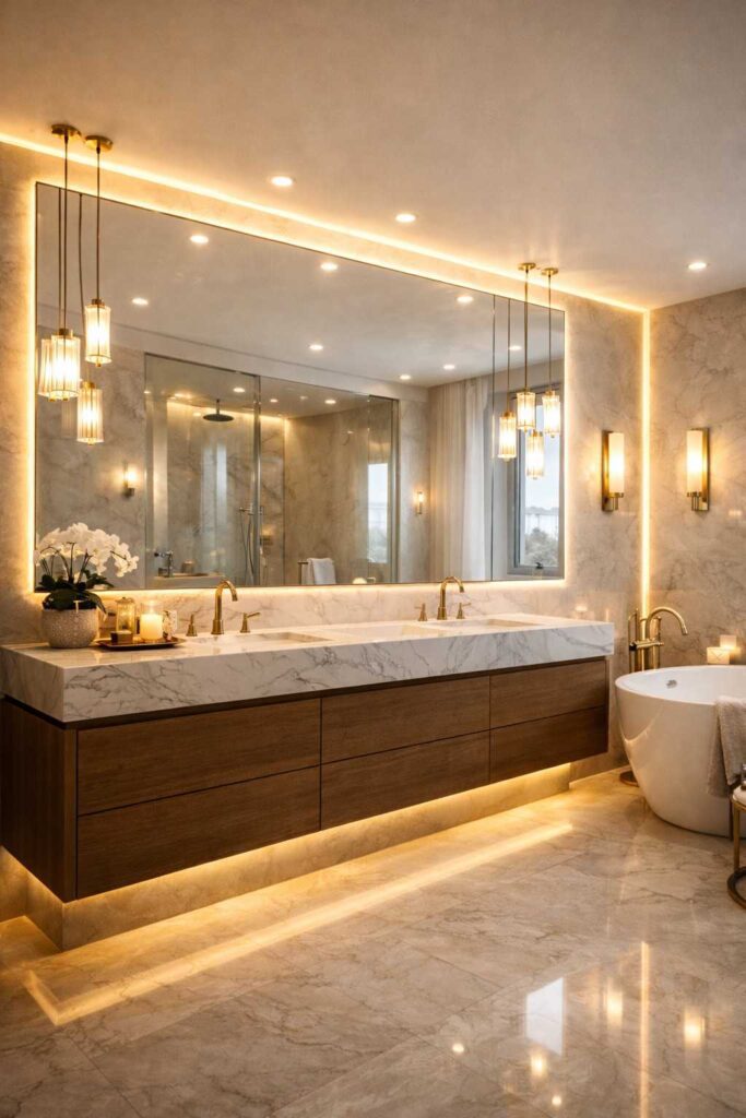 LED lighting adds a modern touch. It can be placed under cabinets, behind mirrors, or along the ceiling.