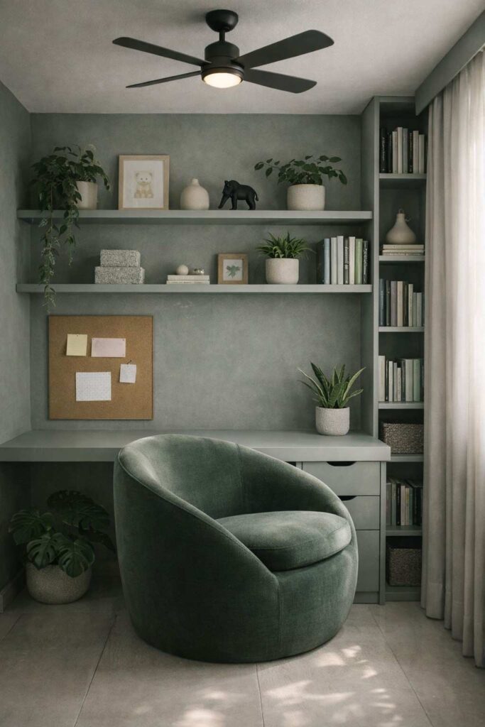 Creating a small workspace doesn’t mean sacrificing comfort or style. This green-grey setup shows how a compact corner can feel both cozy and premium at the same time. The soft, muted tones bring a calming effect, making it easier to focus and relax throughout the day.