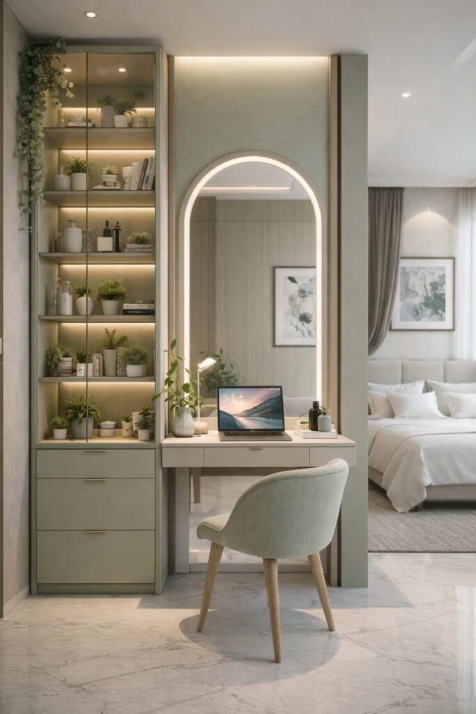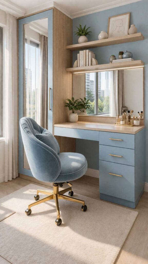 This setup is ideal for small apartments or bedrooms where space is limited but style still matters. Whether you use it for getting ready, working, or daily routines, it keeps your space functional without looking crowded. It’s a smart, clean, and beautiful solution for modern small living.