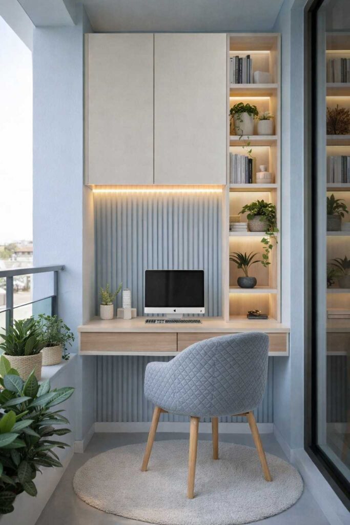 A small balcony can easily turn into a calm and stylish workspace with the right design. This light blue setup creates a fresh and peaceful vibe that feels both cozy and modern.