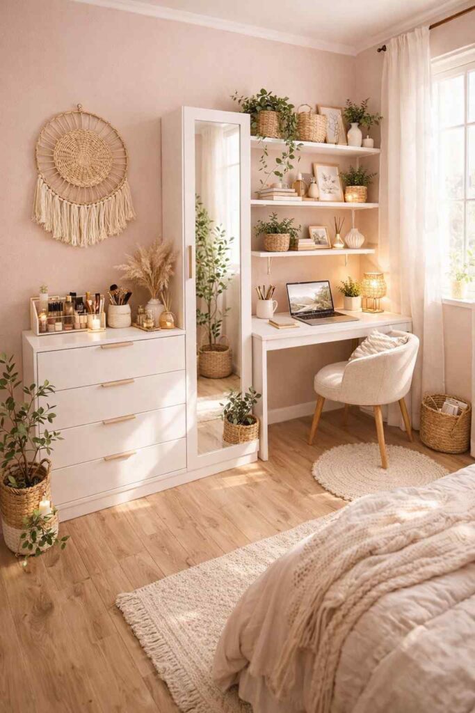 This small space setup is designed to feel calm, cozy, and beautifully organized. The smart combination of a vanity desk and tall storage cabinet makes it easy to save space while keeping everything in one place. It’s a perfect solution for small bedrooms or apartments where every inch matters.