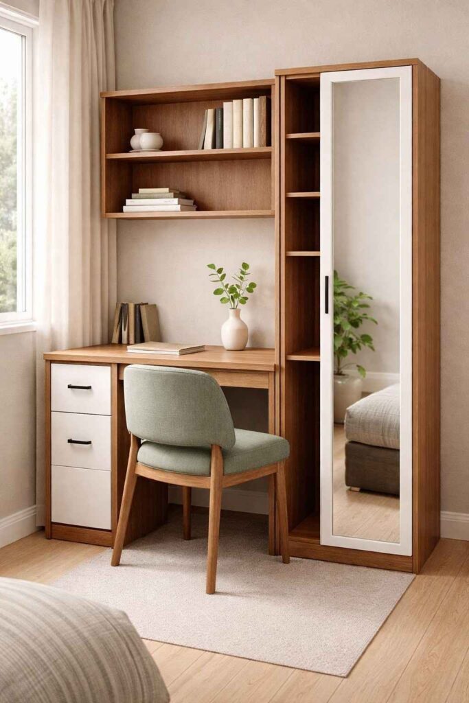A modern small space furniture setup featuring a smart space-saving desk and wardrobe combo in a cozy apartment. The design includes a compact wooden study desk with built-in drawers, overhead shelves for storage, and a tall wardrobe with a full-length mirror. A comfortable upholstered chair provides proper support, while a small indoor plant adds a fresh and calming touch. Soft natural light fills the room, creating a clean, minimal, and clutter-free environment perfect for modern small living.
