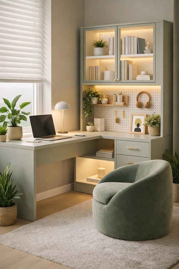 A small space can still feel calm and stylish with the right setup. This sage green workspace creates a cozy and modern vibe.